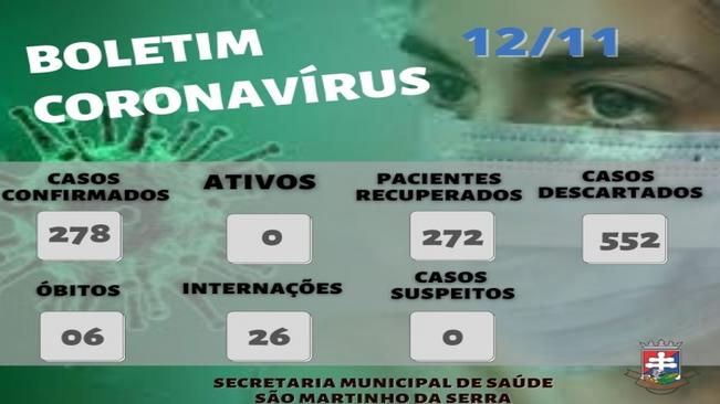 Boletim CORONAVÍRUS ATUALIZADOCasos ativos: 0Casos confirmados (total acumulado): 278Casos ainda suspeitos: 0Pacientes recuperados: 272Casos descartados: 552Internações (total acumulado): 26Internações no momento: 0Óbitos: 06Dados atualizados pela Secretaria Municipal de Saúde dia 29/10/2021.Os casos suspeitos e os ativos seguem em isolamento domiciliar e são monitorados pela equipe de saúde, conforme protocolo.Reforçamos:Use sempre máscaraLave bem as mãosUse álcool em gelEsteja em espaços bem ventiladosEvite aglomeraçõesEm caso de suspeita da doença, ligue para a UBS: (55) 99705-1383
