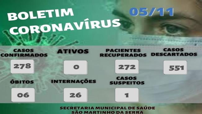 Boletim CORONAVÍRUS ATUALIZADO▪ Casos ativos: 0▪ Casos confirmados (total acumulado): 278▪ Casos ainda suspeitos: 1▪ Pacientes recuperados: 272▪ Casos descartados: 551▪ Internações (total acumulado): 26▪ Internações no momento: 0▪ Óbitos: 06➡️ Dados atualizados pela Secretaria Municipal de Saúde dia 29/10/2021.✅ Os casos suspeitos e os ativos seguem em isolamento domiciliar e são monitorados pela equipe de saúde, conforme protocolo.⛔ Reforçamos:Em caso de suspeita da doença, ligue para a UBS: (55) 99705-1383